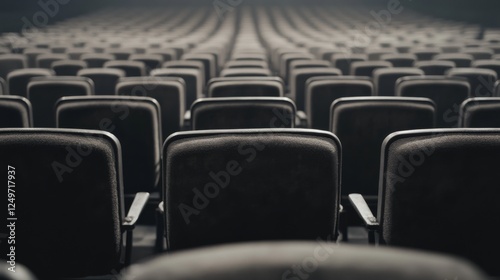 Fototapeta premium Empty theater seats, rows converging, dark hall. Use Event promotion