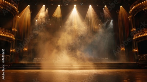 Fototapeta premium Empty Theater Stage Illuminated by Spotlights and Smoke - Dramatic Atmosphere...
