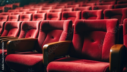 © Lasvu, Fototapeta premium Empty theater with red seats arranged in rows for audience seating.