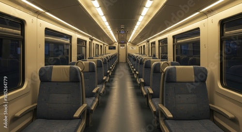 © sri, Obraz premium Empty train interior; lined with blue seats, windows, and illuminated ceiling lights