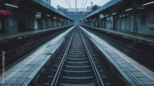 © musa, Obraz premium Empty train station platform with converging railway tracks.