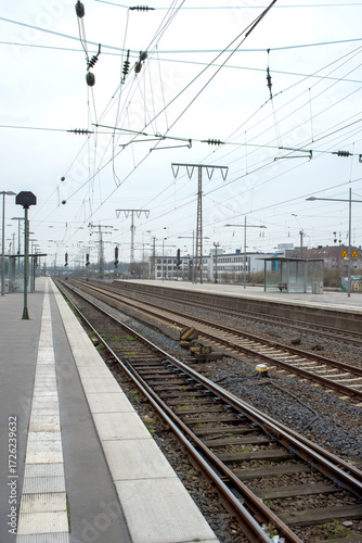 © 코끼리 잠자는, Fototapeta premium Empty Train Station Platform with Overhead Electric Cables