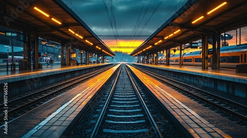 © otwdesign, Fototapeta premium Empty Train Tracks at a Railway Station Platform with a Train in the Distance
