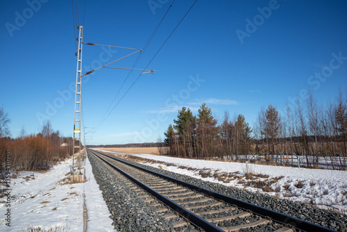 Fototapeta premium Empty train tracks in early springtime, Kempele Finland