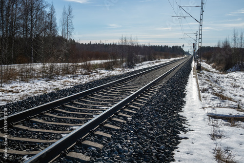 © EsaHiltula, Fototapeta premium Empty train tracks in early springtime, Kempele Finland