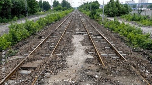 © tugkiara, Fototapeta premium Empty train tracks through overgrown area