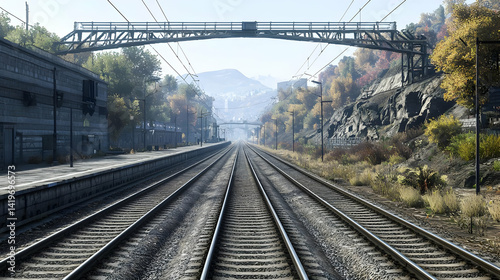 Fototapeta premium Empty Train Tracks Through Urban Landscape In Autumn