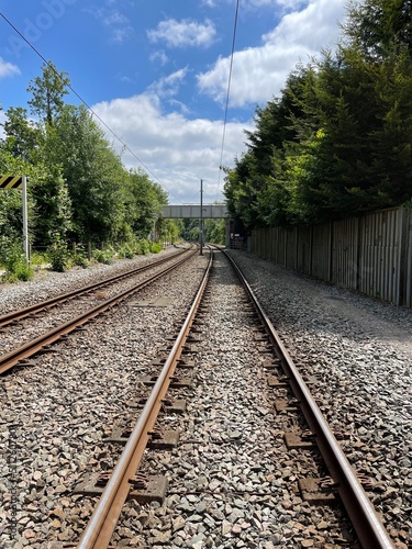 Naklejka premium Empty tram tracks with trees and a blue sky background. Taken in Didsbury England.