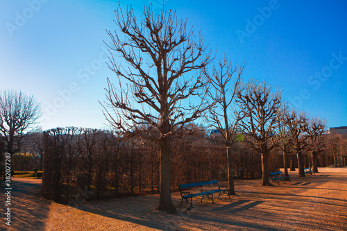 © Leilani, Naklejka premium Empty trees and benches in the park