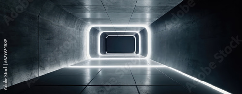 Fototapeta premium Empty tunnel with neon light, Laser lines in the center of the room,...