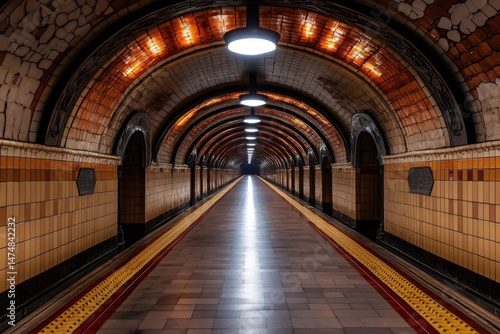 © Gatherina, Fototapeta premium Empty underground city subway tunnel with illuminated ceramic tiles