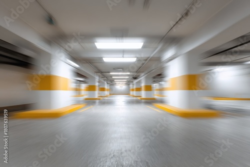 © Andrii Zastrozhnov, Obraz premium Empty underground parking garage with yellow markings and blurred perspective