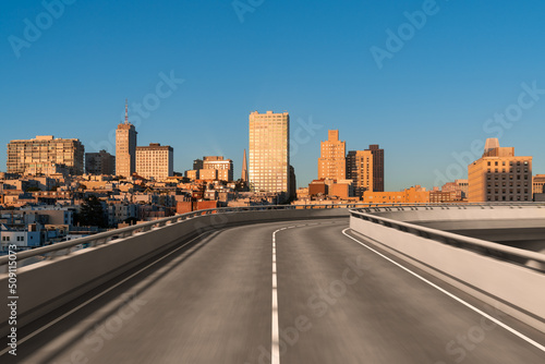 © VideoFlow, Fototapeta premium Empty urban asphalt road exterior with city buildings background. New modern highway concrete construction. Concept way to success. Transportation logistic industry fast delivery. San Francisco. USA.