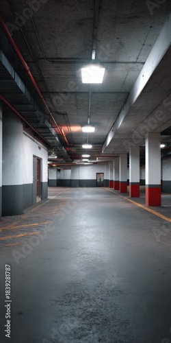 Naklejka premium Empty urban underground parking garage with concrete columns and dim lighting