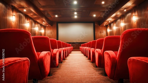 Fototapeta premium Empty vintage movie theater with red velvet seats and blank screen ready for...