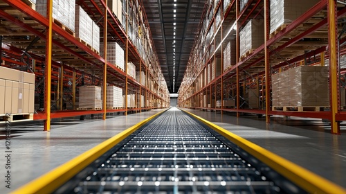 © Khalida, Fototapeta premium Empty warehouse in a logistics center designed for storage and distribution 3D rendering