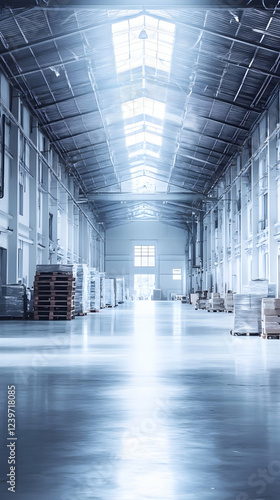 © Siasart Stock, Fototapeta premium Empty Warehouse Interior Shows Pallets and Boxes Stacked Neatly with Bright Lighting