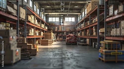 © Generative AI, Obraz premium Empty warehouse interior with shelves pallets boxes and equipment : Generative AI