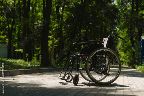 Fototapeta premium Empty Wheelchair in Peaceful Park on Sunny Day