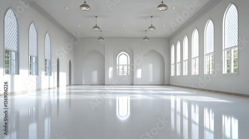 Obraz premium Empty White Architectural Hall With Arch Windows