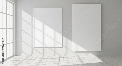 © TheseusStock, Obraz premium Empty White Canvases Mockup Presentation in Bright Contemporary Room with Geometric Sunlit Floor Shadows