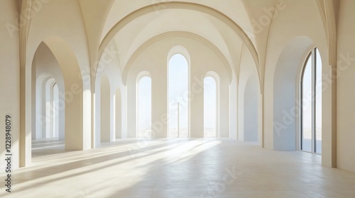 © Galaxyd, Obraz premium Empty white cathedral interior with arched windows and sunlight.