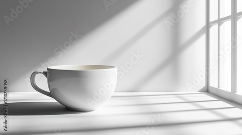 © Almahyra, Obraz premium Empty white coffee cup on a white surface by a window
