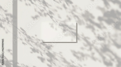 © RulArt, Obraz premium Empty white horizontal rectangle poster mockup with soft hawthorn leaves shadows on neutral light grey concrete wall background. Flat lay, top view 3D illustration
