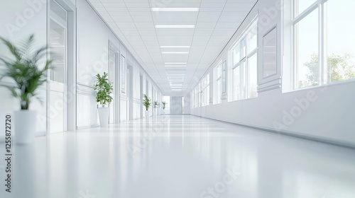 Fototapeta premium Empty White Hospital Corridor With Plants