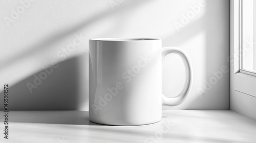 © Sans, Obraz premium Empty white mug on a windowsill in soft light.