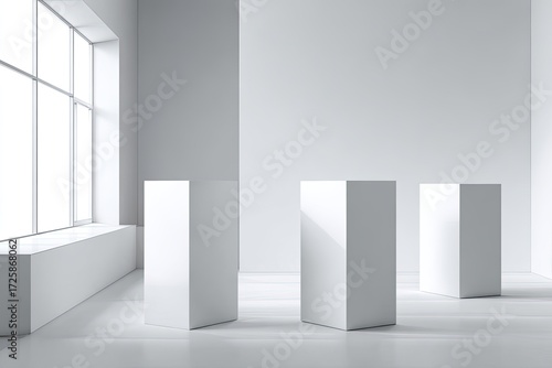 © Rendi, Obraz premium Empty white room with three white display cubes