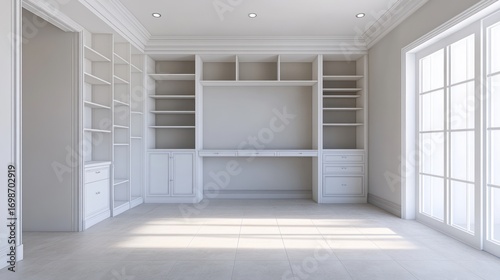 © Imam Soleh, Fototapeta premium Empty white study room with built in bookshelves
