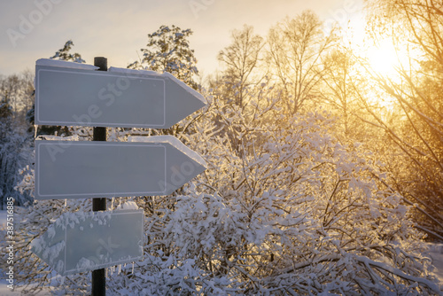 © exebiche, Naklejka premium Empty white track pointers, guidepost in sunlight against winter nature background. Directional arrow signs on wooden pole in snowy forest.