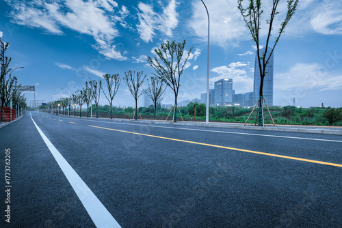© zhao dongfang, Naklejka premium Empty winding asphalt road through a modern urban park area with city buildings in the background under a blue sky.