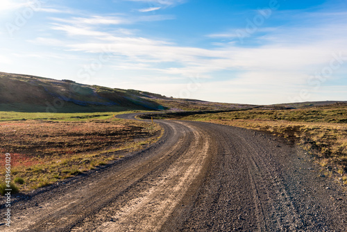 Naklejka premium Empty winding gravel road in a barren landscape in Iceland on a sunny summer...