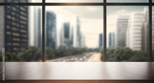 Fototapeta premium Empty wood desk, office display copy space, windows with blurred city road...