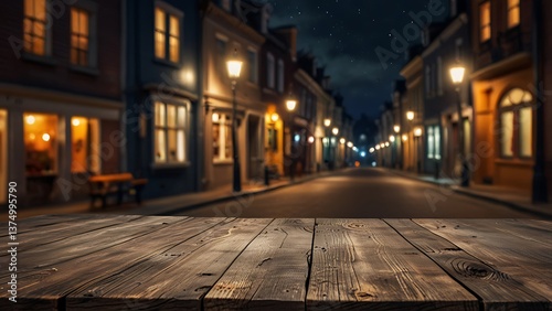 © Agung, Fototapeta premium Empty wood table top on Halloween street with a blurred background. The focus is on the table surface