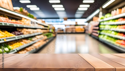 Fototapeta premium empty wood table top with a blurred supermarket setting in the background