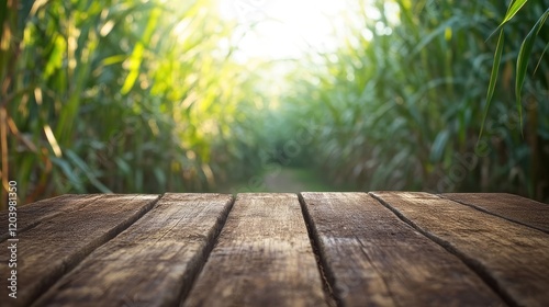 © ElenaElena, Fototapeta premium Empty wooden brown table top with blur background of sugarcane plantation. Generated AI