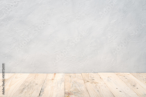 © Abdull, Fototapeta premium Empty wooden deck table over white textured wall background