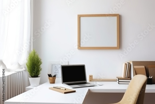 Obraz premium Empty wooden frame with copy space in office on white wall, created using...
