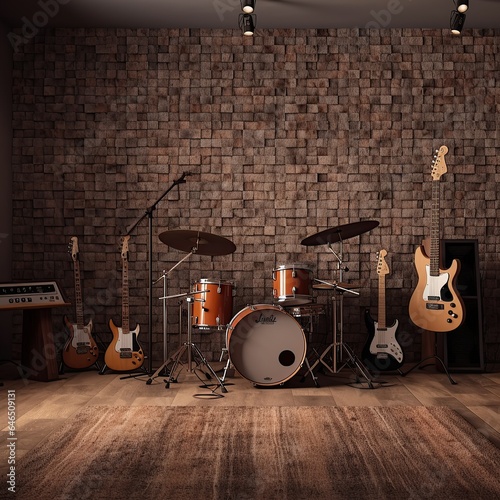Fototapeta premium Empty wooden music recording studio with guitar and music equipment. AI...
