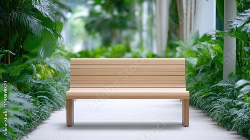© PAPAHJAHATZ, Fototapeta premium Empty wooden park bench in a lush garden setting
