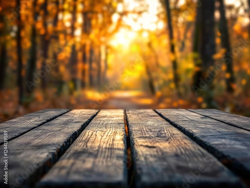 © iting, Fototapeta premium Empty wooden picnic table in autumn forest.