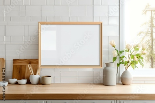 © Werckmeister, Obraz premium Empty wooden picture frame mockup hanging on beige wall background. Boho shaped vase, flowers on table.