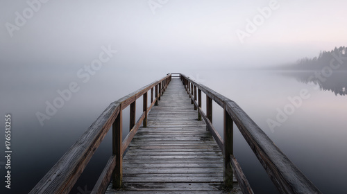 © Lerson, Fototapeta premium Empty wooden pier stretching into calm misty lake with soft pastel sky and distant tree line creating peaceful atmosphere