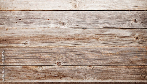 © evgeeenius, Obraz premium Empty wooden shelve in front of wooden wall