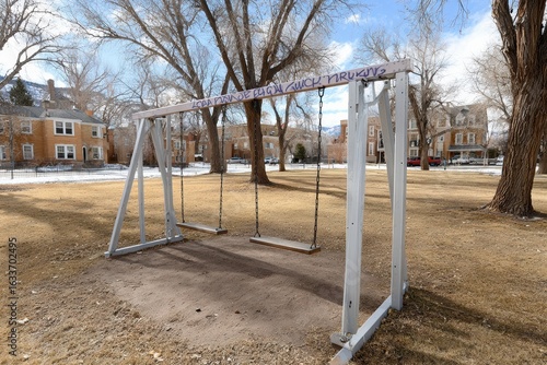 © aiLover, Fototapeta premium Empty wooden swing set dominates quiet urban park in winter. Bare trees, historical residential buildings, clear sky frame scene, evoking feelings nostalgia solitude in forgotten playground area.