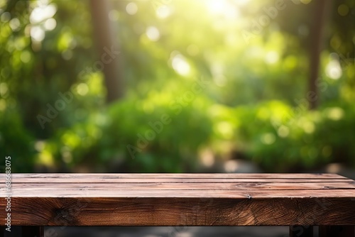 Fototapeta premium Empty wooden table across summer time in backyard garden