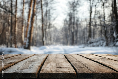© Oksana, Fototapeta premium Empty wooden table amidst a snowy wooded landscape.